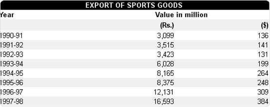 Export of sports goods increased from $136 million in 1990-91 to $384 million in 1997-98. Showing an average increase of 23 per cent annum